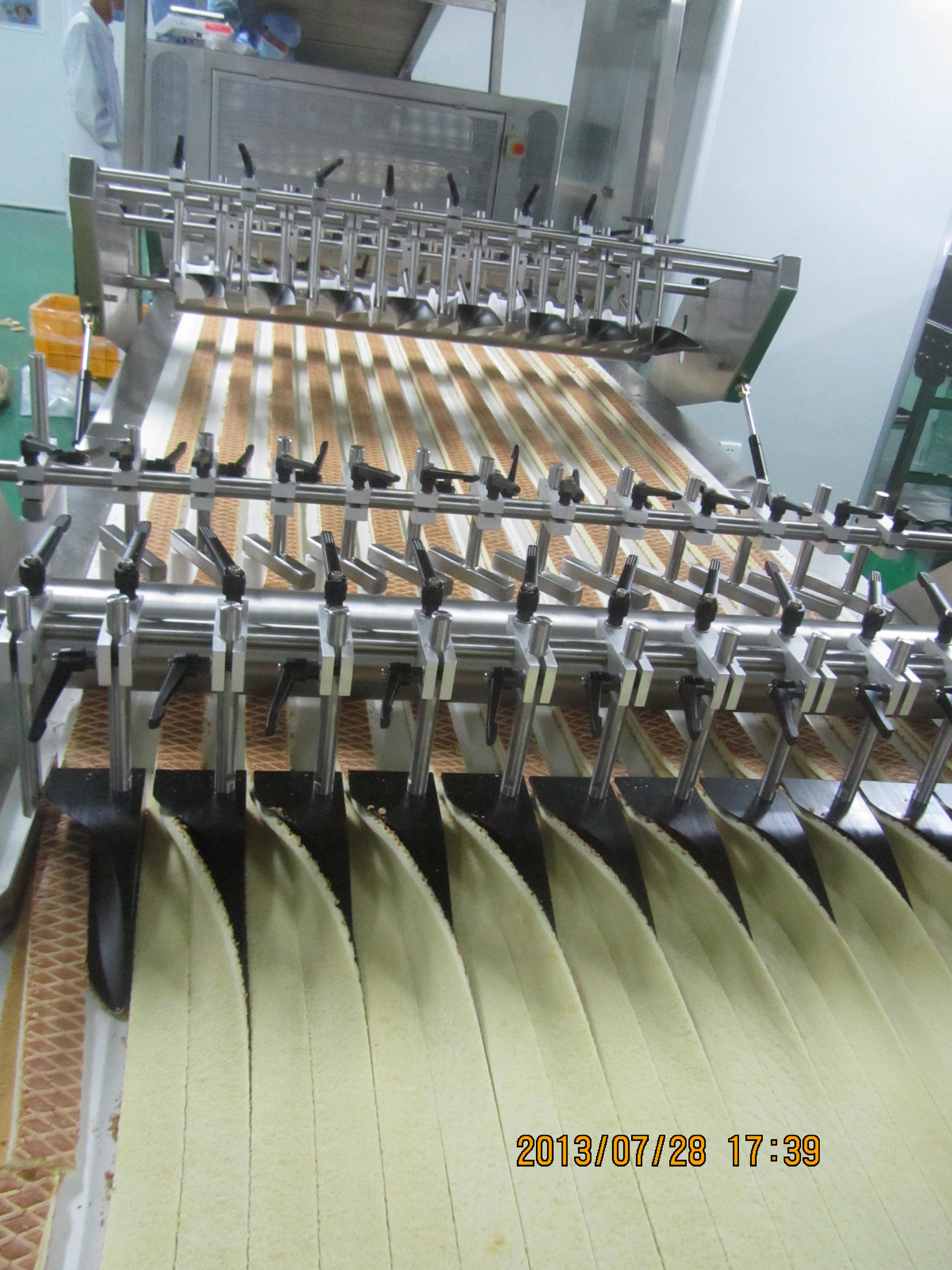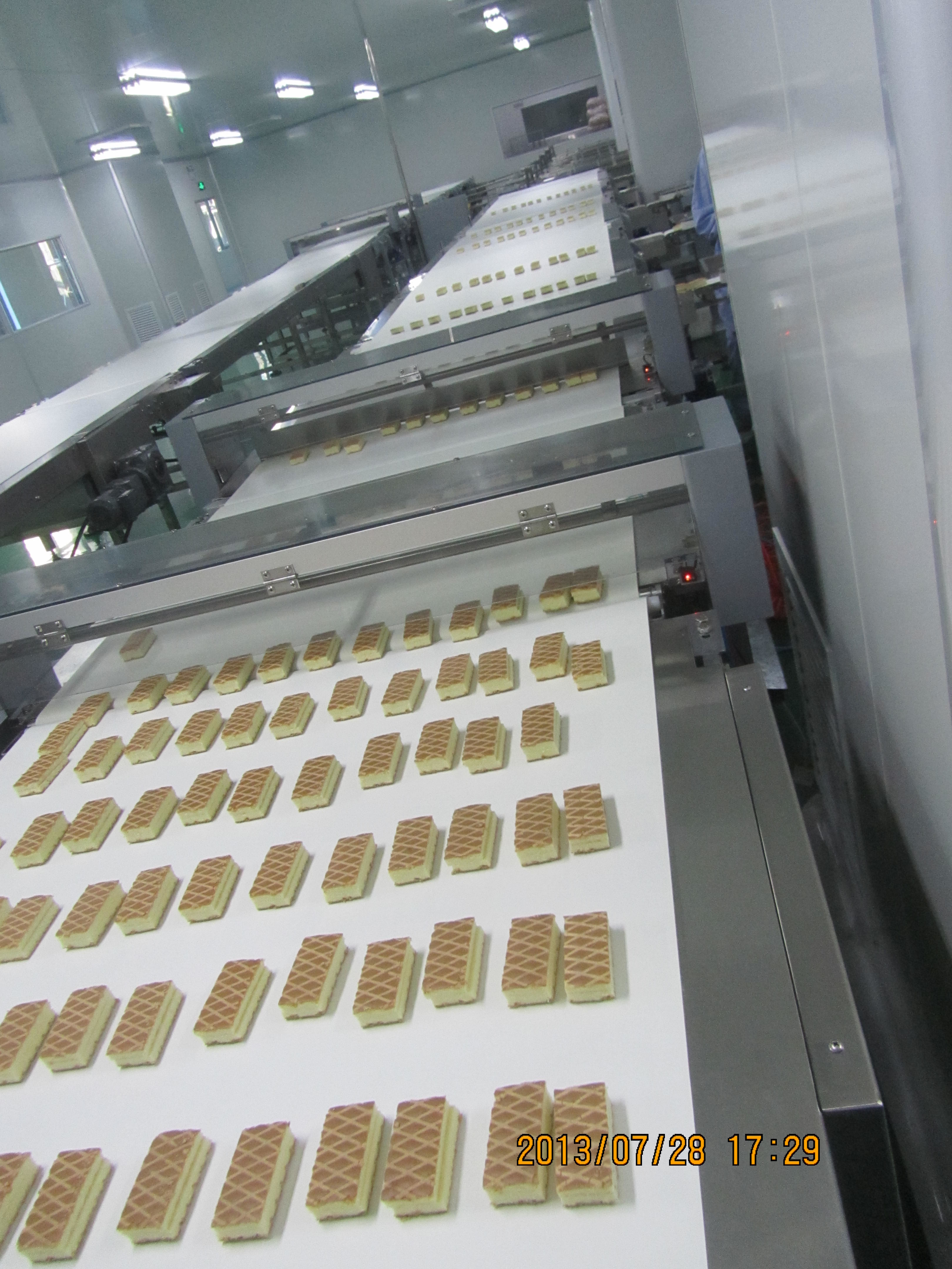 Смешанный бэттер коллекторн на стальном листе и печет в печь тоннеля, после выпечки, лист торта разделен в линейные торты, половина их подъем вверх, другие окантованы и наклеенная сливк, после этого верхний линейный торт положенный на нижний слой, наслоенный линейный торт отрезана в индивидуально с определенными размерами части после этого транспортирует к машине упаковки.